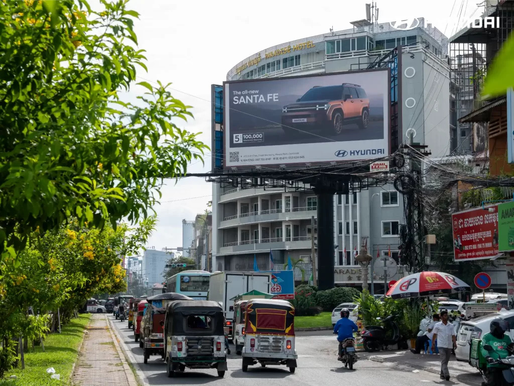 Adding to the city’s vibrant skyline, Phsar Thmei zone billboard features The new 2025 Hyundai CUSTIN, The all-new 2026 Hyundai Palisade, and The all-new Hyundai SANTA FE, representing Hyundai’s dynamic blend of power, luxury and innovation.